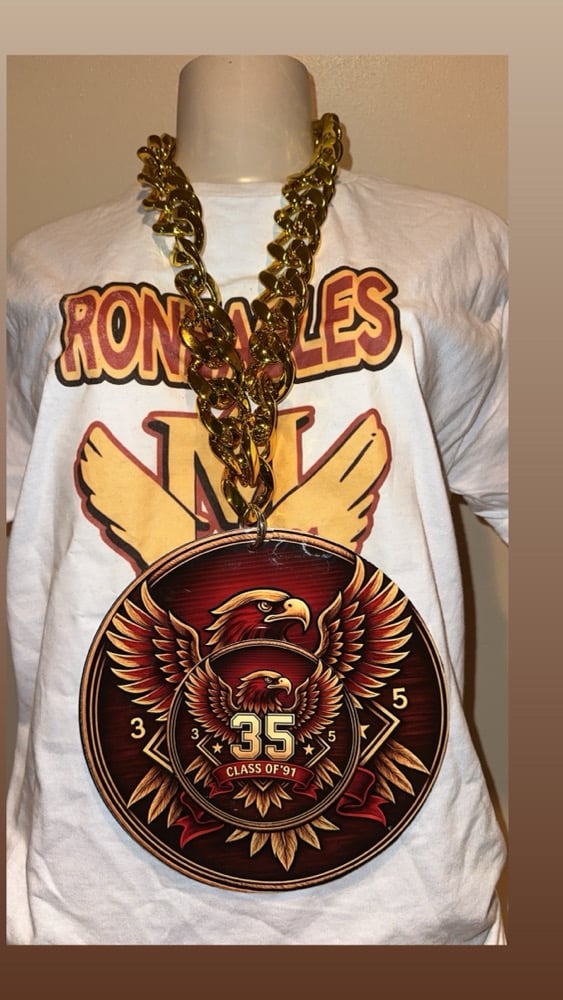 Custom 4inch and 8 inch acrylic round medallion. 4 inch comes with a 36 inch bead necklace. 8 inch comes with 36 inch costume link chain.